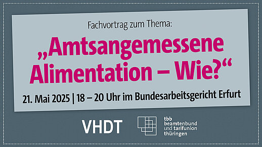 Aktuelles/NewsVeranstaltungen tbb konkret 2025 Seite 2 von 2. vorherige 1 2 13.05.2025Digitalreihe BeihilfeSie werden verbeamtet?!Es ergeben sich viele Fragen bei der Verbeamtung im öffentlichen Dienst. Was kommt auf Sie zu? Weiterlesen.. 09.04.2025Die dbb jugend thüringen lädt ein zum:Digital Detox Seminar mit gemeinsamer BootstourWer entscheidet, was du als nächstes tust? Dein Handy? Eine eingehende E-Mail? Der neue social Media Beitrag? Die Generation Smartphone switcht alle 2 Min. ihren Fokus und diese digitale… Weiterlesen.. 27.03.2025Fachvortrags- und Diskussionsveranstaltung am 21. Mai 2025 (Mi.) | 18 – 20 UhrFachvortrag: „Amtsangemessene Alimentation – Wie?“ im Bundesarbeitsgericht (BAG) Erfurt - Keine Anmeldung mehr möglich!Die abgekoppelte Besoldung in Deutschland und Thüringen zwischen "Hybridbildung" und Verfall. tbb beamtenbund und tarifunion thüringen und der Verband der VHDT-Verwaltungsbeamten des Höheren… Weiterlesen.. Seite 2 von 2. vorherige 1 2