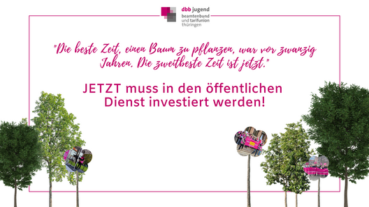Auch wir als dbb jugend thüringen fordern Investitionen in den öffentlichen Dienst: Für einen zukunftssicheren öffentlichen Dienst bedarf es fairer und moderner Rahmenbedingungen, Fachkräfte müssen gewonnen und gehalten werden. Dbb Chef Volker Geyer macht deutlich: „Die öffentliche Daseinsvorsorge ist chronisch unterfinanziert […] Klar ist: Die Staats- und Verwaltungsmodernisierung ist ein Marathon, kein Sprint. […] Das durch Modernisierungsvorhaben eingesparte Geld muss beispielsweise in eine Weiterbildungsoffensive für die Beschäftigten und attraktivere Arbeitsbedingungen investiert werden, so wie es der ‚Effizienzfonds‘ im Koalitionsvertrag vorsieht. Denn es ist zwingend erforderlich, gerade im Bereich der Digitalisierung mehr eigene Kompetenzen aufzubauen.“